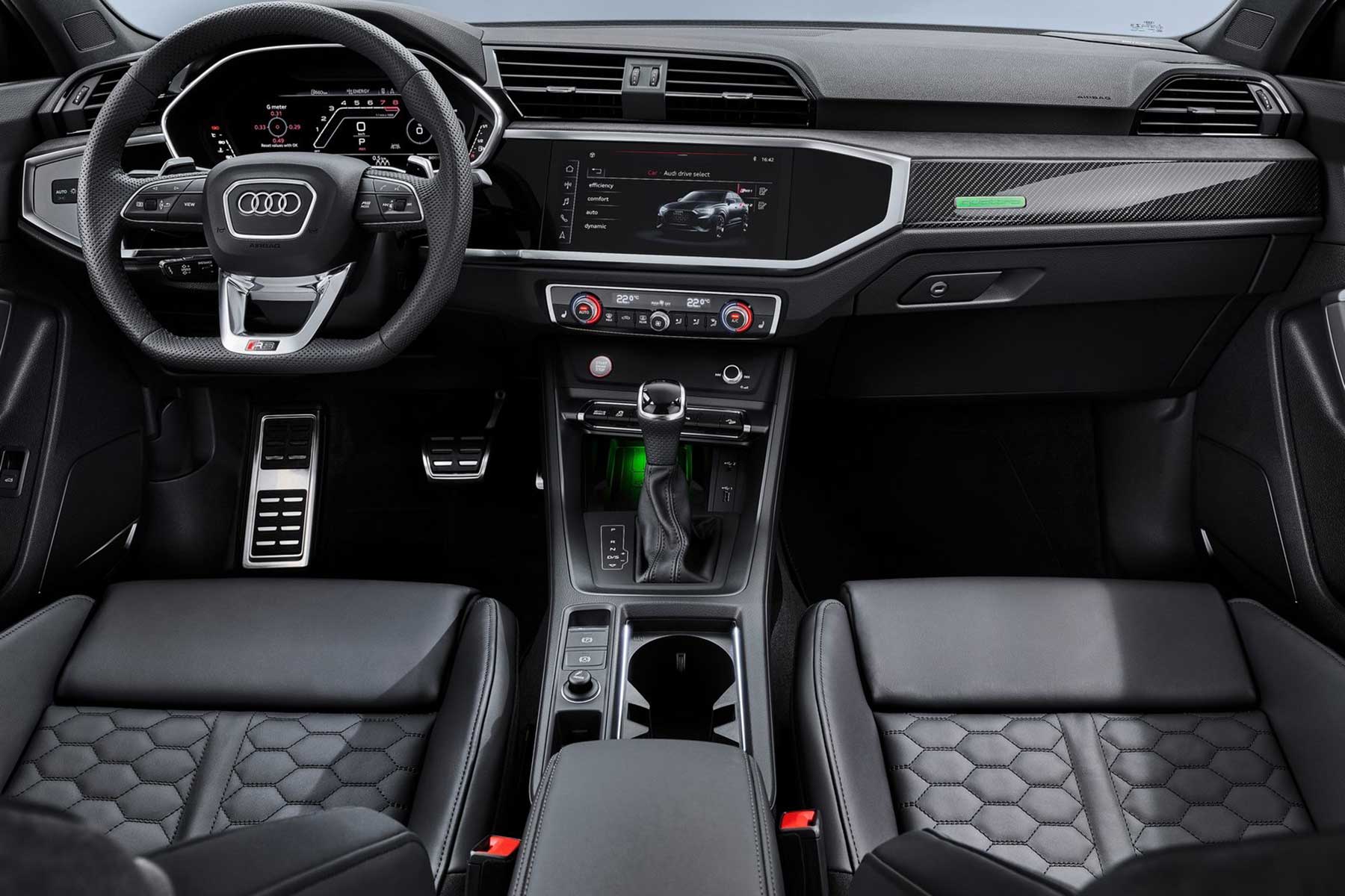 Kao i ostali nedavno predstavljeni modeli RS i Q3 i Q3 Sportback vizualno su ukrašeni na prepoznatljiv način. Sprijeda se ističu crna saćasta maska, veliki usisnici i “poštanski sandučić” između maske i poklopca motora. Rubovi blatobrana za jedan su centimetar širi od onih na ostalim modelima. Ispod njih su 20-colni kotači, a uz doplatu mogu biti i col veći. Kočnice su veće, a uz doplatu mogu biti i karbonsko-keramičke. Na kraju krova je crni spojler, a iz stražnjeg odbojnika vire dvije ovalne ispušne cijevi.