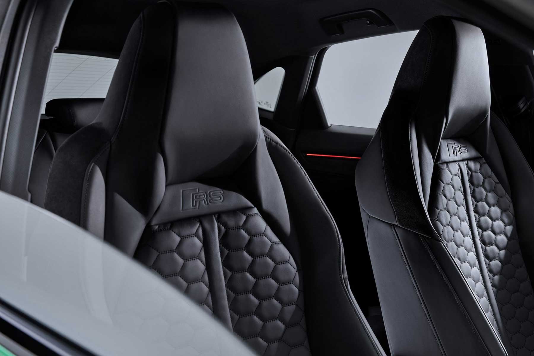 U unutrašnjosti su također svi obavezni elementi, poput sportskih sjedala, s tim da ona s integriranim naslonima za glavu nisu s popisa serijske opreme. Na popisu je Virtual Cockpit, ali ne njegova najveća i najbogatija verzija. Pomoću sustava Audi Drive Select vozač može birati različite načine rada kao što su Comfort, Dynamic, Efficiency, Individual, Auto i nove opcije RS1 i RS2.