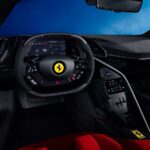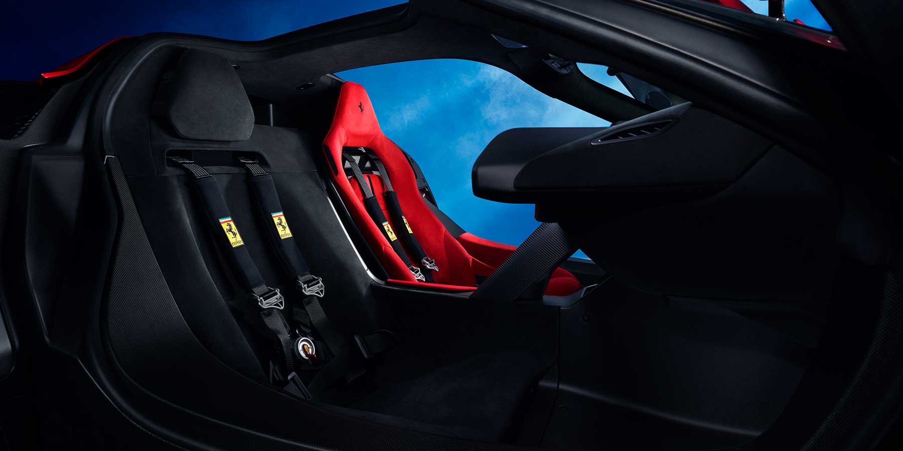 Iznutra je kabina potpuno usredotočena na vozača koji sjedi na crvenom školjkastom sjedalu. Putnik je degradiran u status “+1”, sa sjedalom koje je uliveno u šasiju. Kabina je dizajnirana tako da prednji dio F80 bude što manji. Jajoliki kotačić drži većinu glavnih kontrola, a Ferrari se vratio korištenju više fizičkih gumba umjesto ekrana i podloga osjetljivih na dodir.