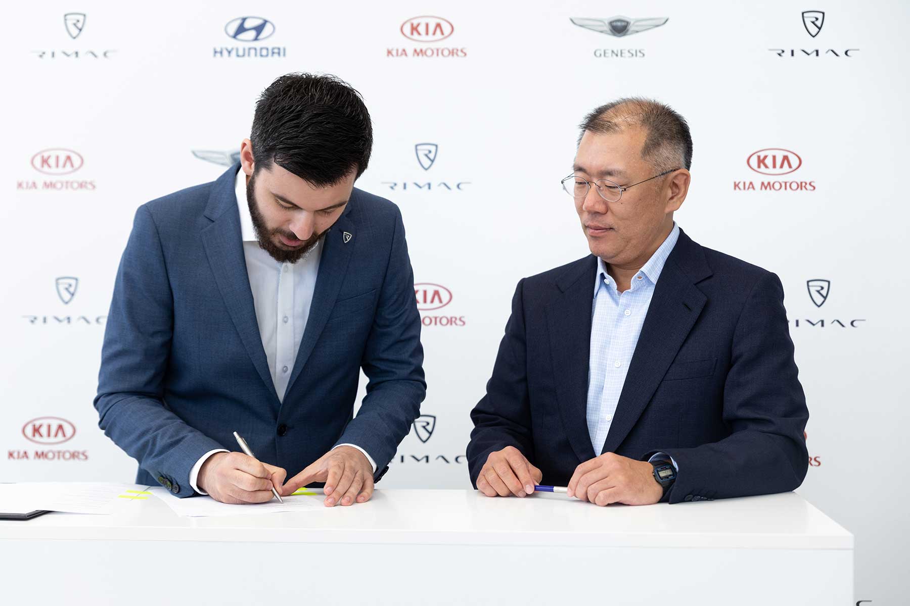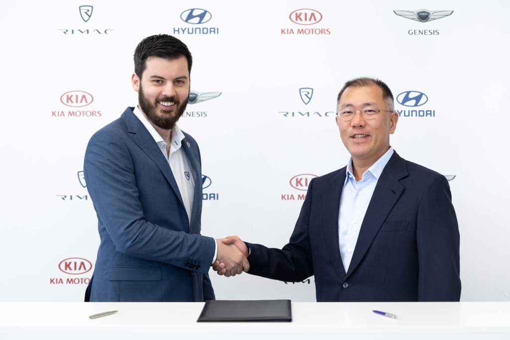 Izvršni potpredsjednik Hyundai Motor Group Euisun Chung i Mate Rimac službeno su potpisali suradnju prilikom Chungovog posjeta Rimac Automobilima u Svetoj Nedelji, 13. svibnja. “Rimac je inovativna tvrtka s izvanrednim sposobnostima u električnim vozilima visokih performansi”, rekao je Euisun Chung, izvršni potpredsjednik Hyundai Motor Group, “Njihovi startup korijeni i bogato iskustvo u suradnji s proizvođačima automobila u kombinaciji s tehnološkom snagom čine Rimac idealnim partnerom za nas. Radujemo se suradnji s Rimcem na našem putu prema čistoj mobilnosti. ”