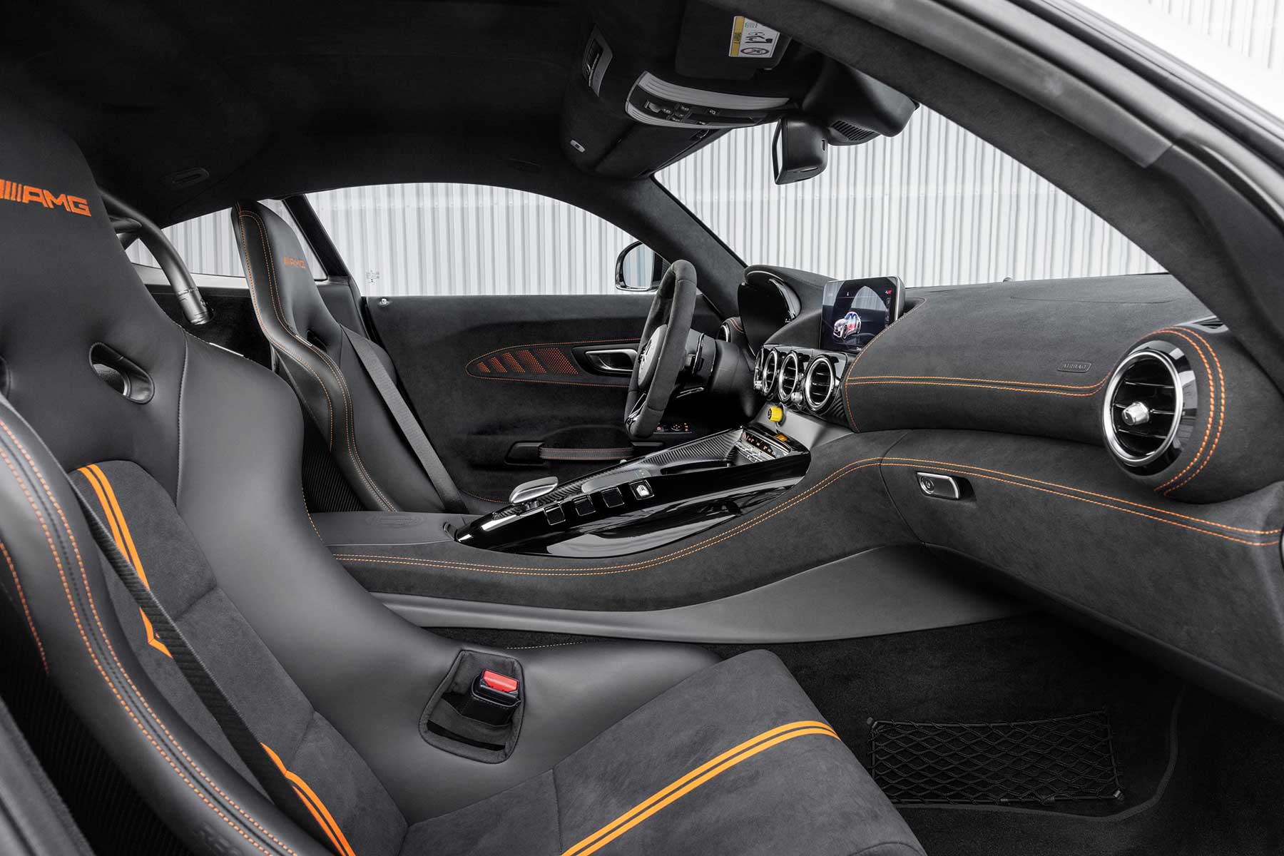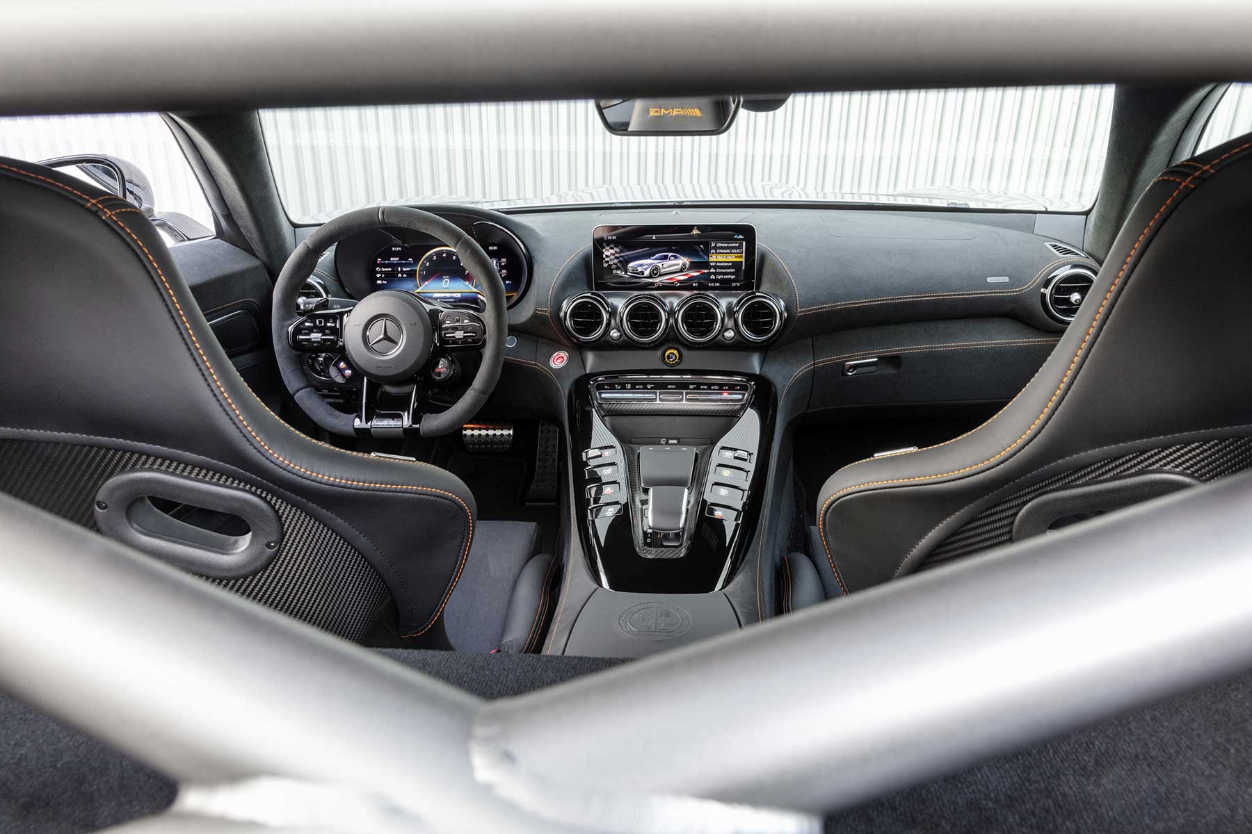 Unutrašnjost je presvučena nappa kožom i crnom mikrofibrom s narančastim prošavima. Obloge vrata imaju obruče za zatvaranje umjesto klasičnih ručki, kako bi bile lakše. Školjkasta sportska sjedala su od karbonskih vlakana, također kako bi bila lakša. Ali to nije sve… Ako vam sve nabrojano još uvijek nije dovoljno možete naručiti AMG Track Pack. U tom slučaju dobit ćete još i zaštitni kavez od titana, sigurnosne pojaseve u četiri točke i aparat za gašenje.