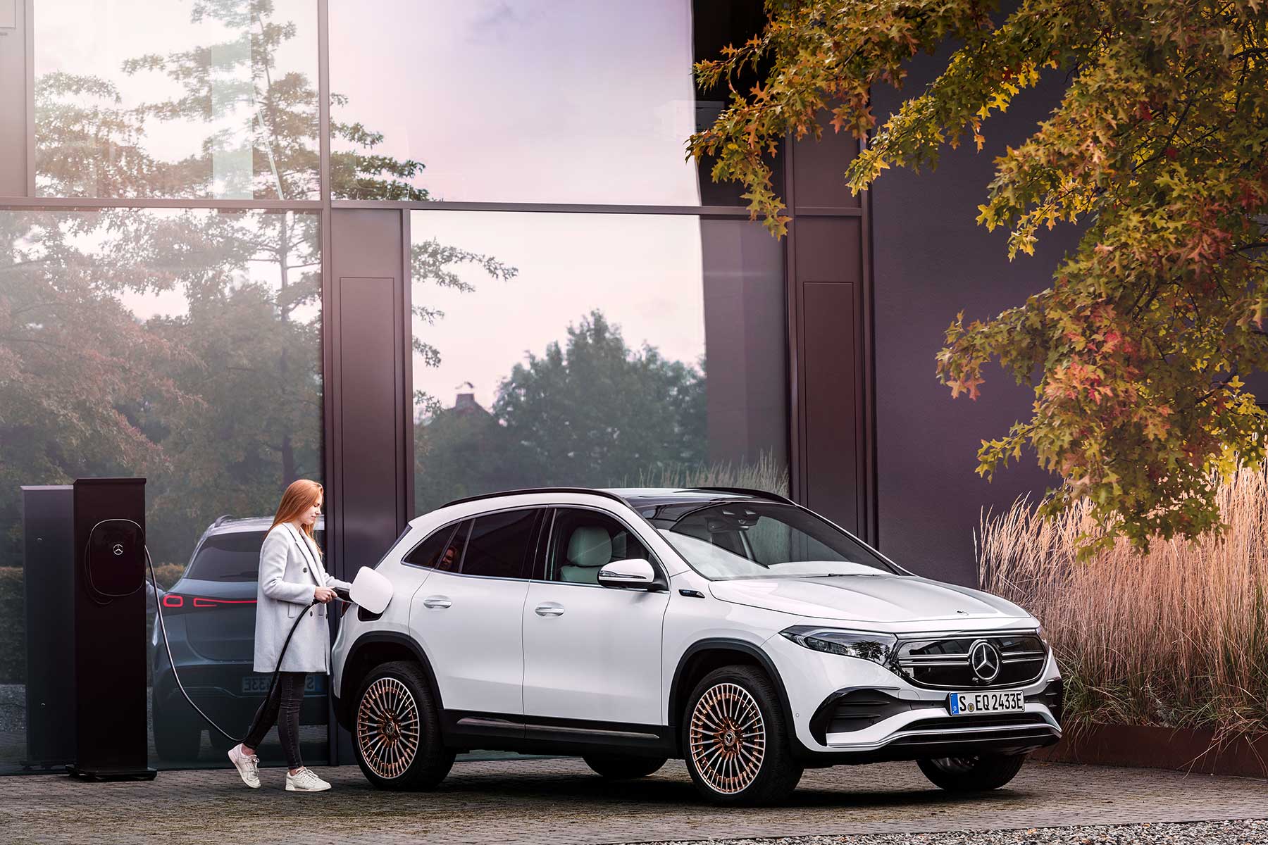 Na početku će se Mercedes EQA nuditi u verziji označenoj kao EQA 250 iza koje se skrivaju snaga motora od 140 kW i doseg od 426 kilometara s jednim punjenjem baterije prema ciklusu WLTP. Nakon njega na tržište će stići i druge verzije koje će s jedne strane uključivati sportske modele s pogonom na sve kotače i dodatnim električnim pogonom (eATS) i snagom od 200 kW ili više, a s druge strane izvedbu s dosegom od preko 500 kilometara prema WLTP-u. Litij-ionska baterija, koja je postavljena kao strukturni element ispod vozila, ima kapacitet od 66,5 kWh. Kako bi se zadovoljili visoki standardi udobnosti što se tiče buke i vibracija po kojima je ova marka poznata, poduzete su kompleksne mjere za izoliranje električnog pogona od podvozja i karoserije.