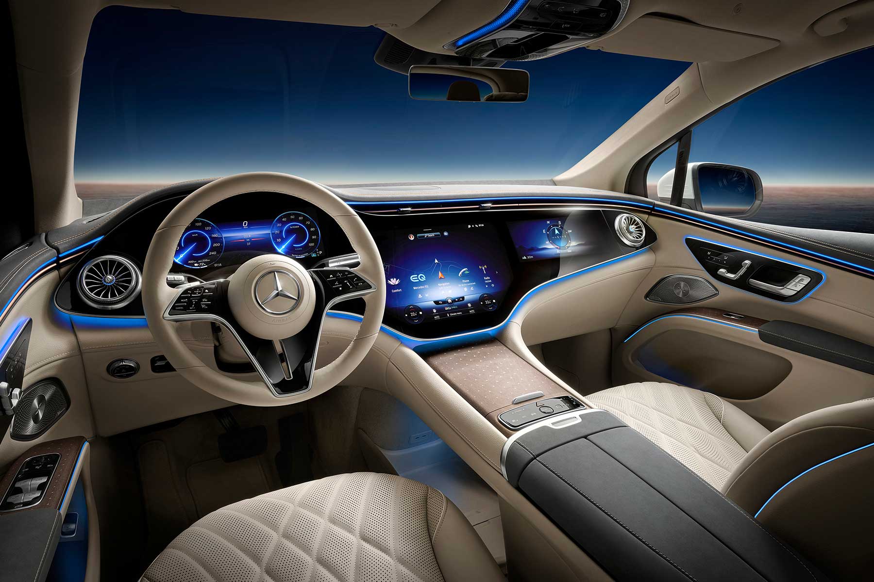 Pored spomenutog zaobljenog oblika, nema velikih iznenađenja po pitanju izgleda EQS SUV-a. On je tipičan električni Mercedes sa zatvorenom maskom i spojenim stražnjim svjetlima. Niti unutrašnjost ne donosi velika iznenađenja. Slična je EQS-u, a i ovdje je na popisu opcija ogromni Hyperscreen, kombinacija tri ekrana koji se protežu čitavom širinom armature pod jednim velikim staklenim pokrovom.