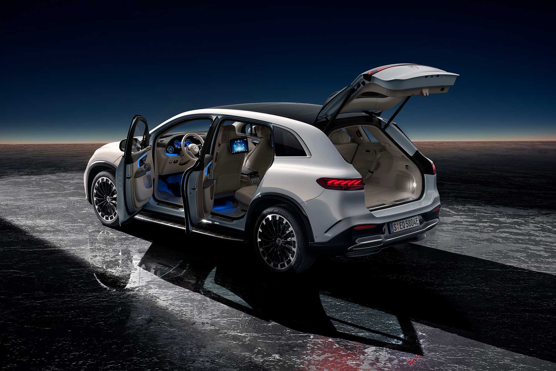 Kao i kod EQS-a bez dodatka SUV u imenu u ponudi su trenutno dvije vrste pogona. Kod modela 450+ jedan elektromotor pokreće stražnje kotače, a raspolaže s 360 KS i 568 Nm. Performanse i doseg s jednim punjenjem baterije još nije objavljen, ali Mercedes obećava “do 600 kilometara”. Baterije su ukupnog kapaciteta 107,8 kWh. Drugi je model 580 4Matic čija dva elektromotora, po jedan za svaki par kotača, isporučuju ukupno 544 KS i 858 Nm. Niti njegove performanse i doseg još nisu objavljeni. Oba modela mogu se puniti na najviše 200 kW i trebali bi se, ju teoriji, od 10 do 80 posto napuniti za 31 minutu.