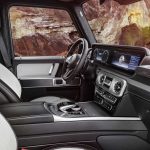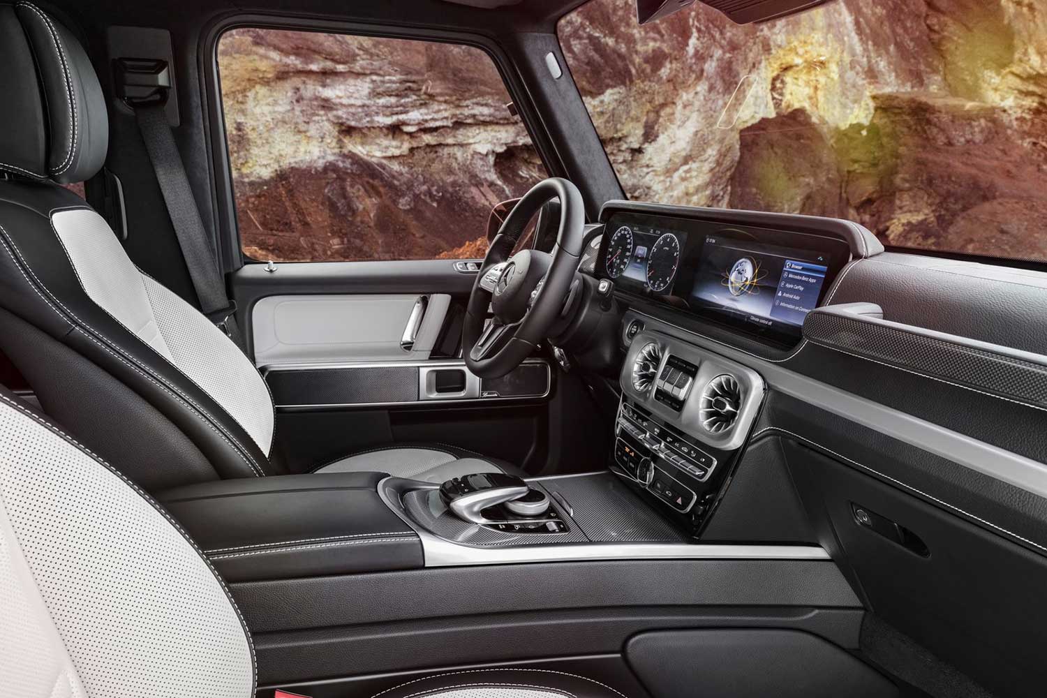 Unutrašnjost je uređena moderno i u skladu s aktualnim Mercedesovim modelima uz zadržavanje nekih prepoznatljivih detalja poput, primjerice, rukohvata ispred suvozača i prekidača za zaključavanje diferencijala. Kao i aktualna E-klasa, u unutrašnjosti nove G-klase vozač ispred sebe može imati dva 12,3-inčna ekrana. U slabijim paketima opreme iza volana stoje analogni instrumenti, ali središnji veliki ekran uvijek je prisutan.