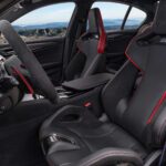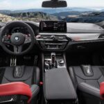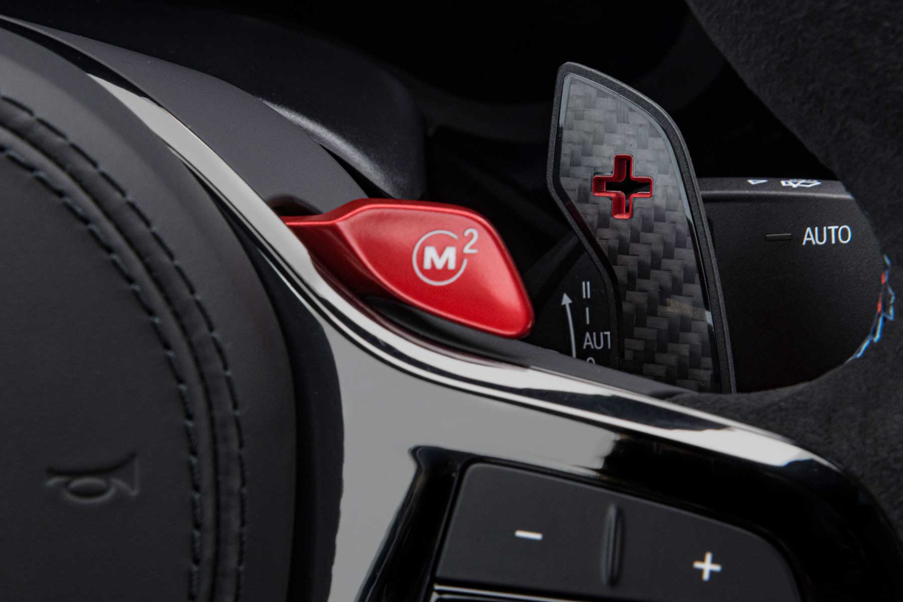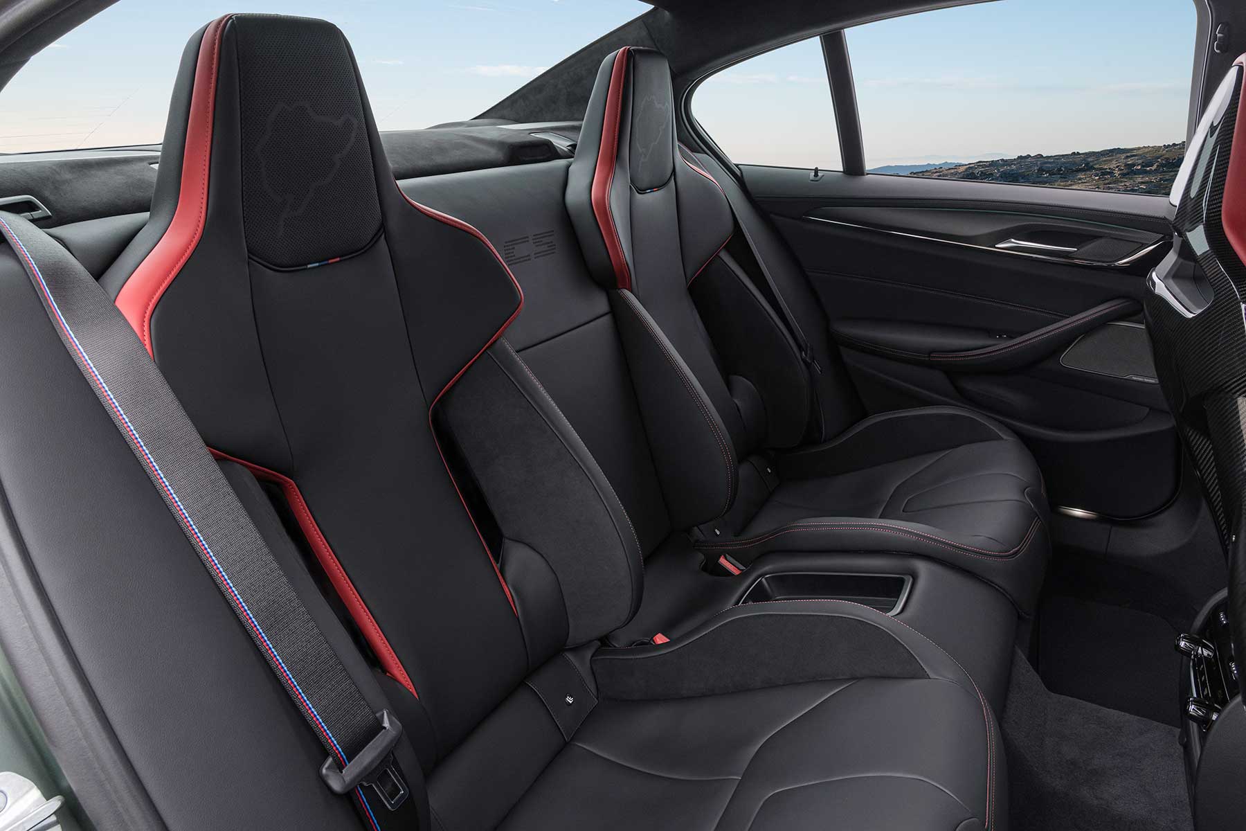 Naravno, BMW M5 CS ima prostor i za putnike straga, ali umjesto klasične stražnje klupe na njezinom su mjestu dva školjkasta sjedala. Sva sjedala presvučena su crnom kožom Merino s crvenim Mugello Red prošavima. Na naslonima za glavu nalaze se osvijetljeni logotipi M5, a iza volana su polugice za izmjenu brzina izrađene od karbona.