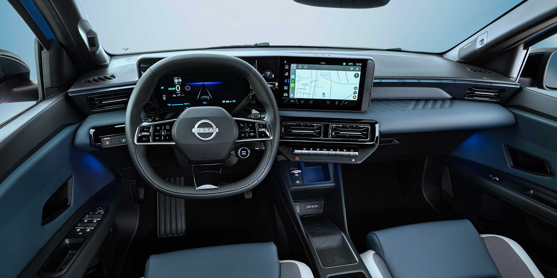 Nissan je dosta posudio od Renaulta za unutrašnjost Micre. Izgled je gotovo jednak, osim Nissanovih oznaka na upravljaču. Bez obzira na to, ovo je dobro i funkcionalno uređenje, s dva digitalna ekrana od 10,1 inča, jednim koji se može konfigurirati za instrumente, a drugim za infotainment, blago okrenutim prema vozaču.