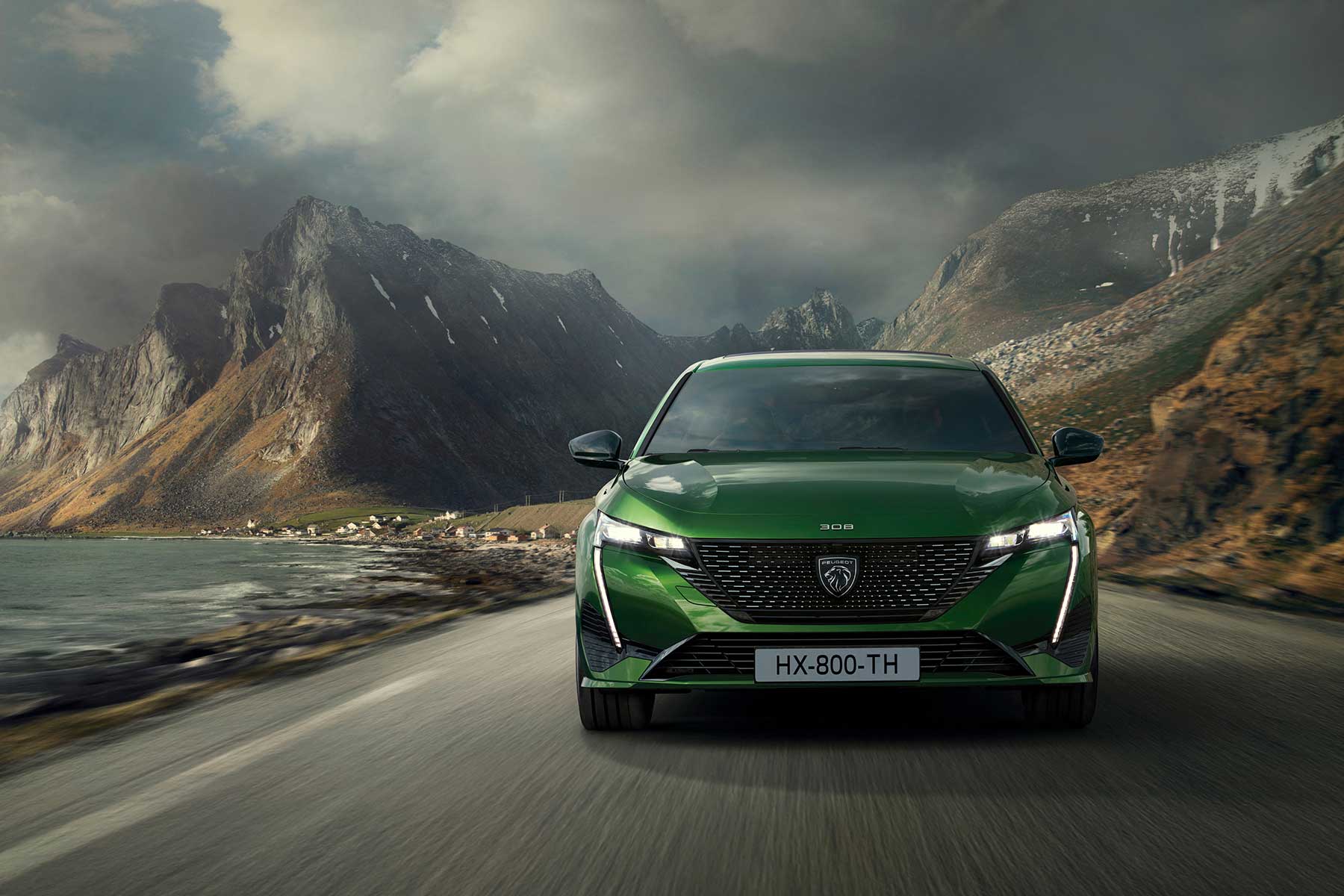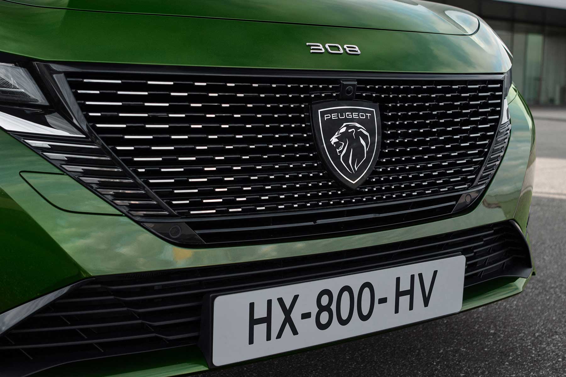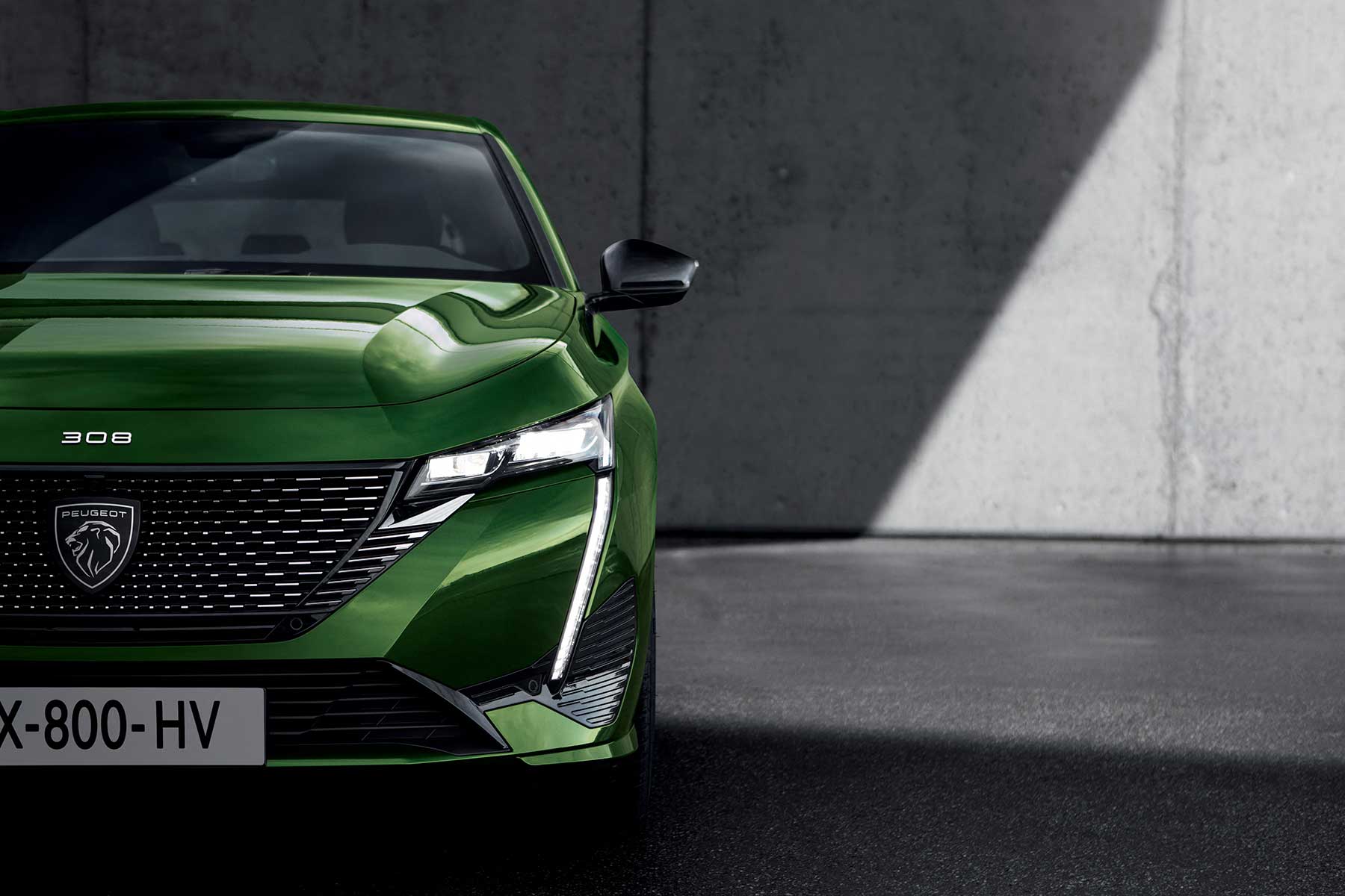 Dizajnerski, novi je 308 daleko agresivniji i ima prilično “opak pogled” zahvaljujući tankim i nagnutim LED prednjim svjetlima. LED matrična svjetla serijska su na modelima GT i GT Pack. Novi kućni stil obilježavaju vertikalne LED trake koje služe kao dnevna svjetla i pokazivači smjera. Registarska pločica preselila je kat niže, a središnje mjesto zauzima veliki novi Peugeotov logotip iza kojeg je smješten radar pasivnih i aktivnih sustava sigurnosti. Poklopac motora je duži i manje nagnut nego kod prošle generacije.