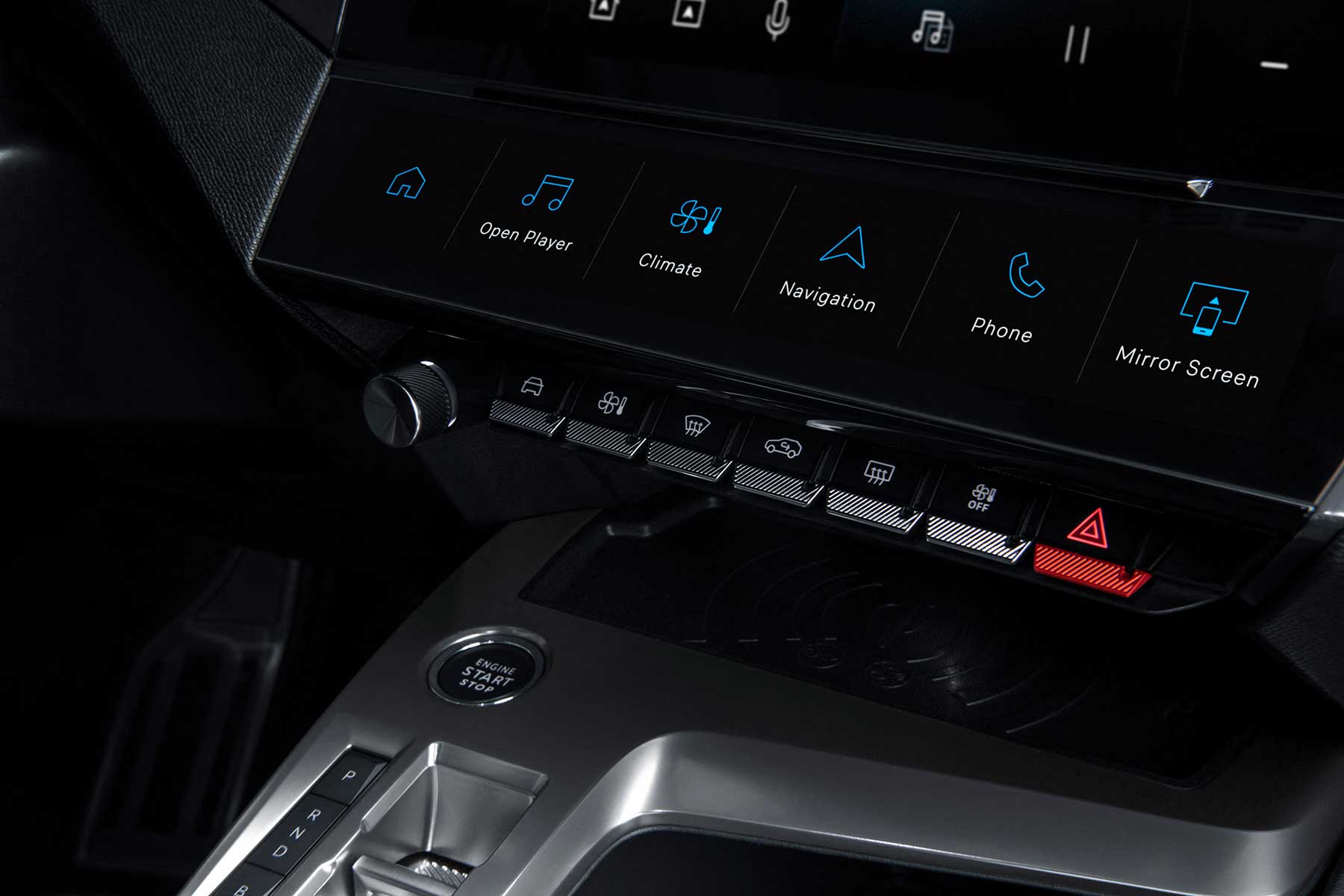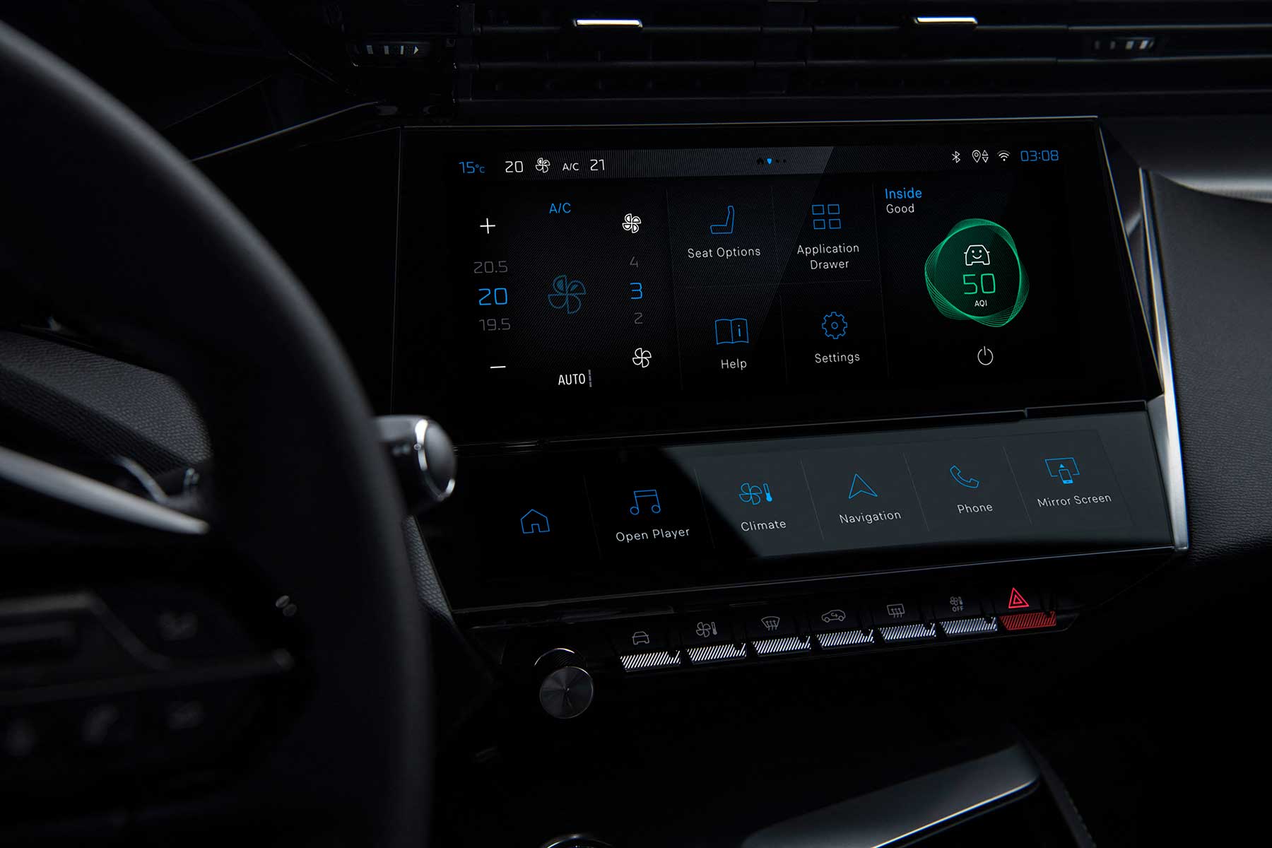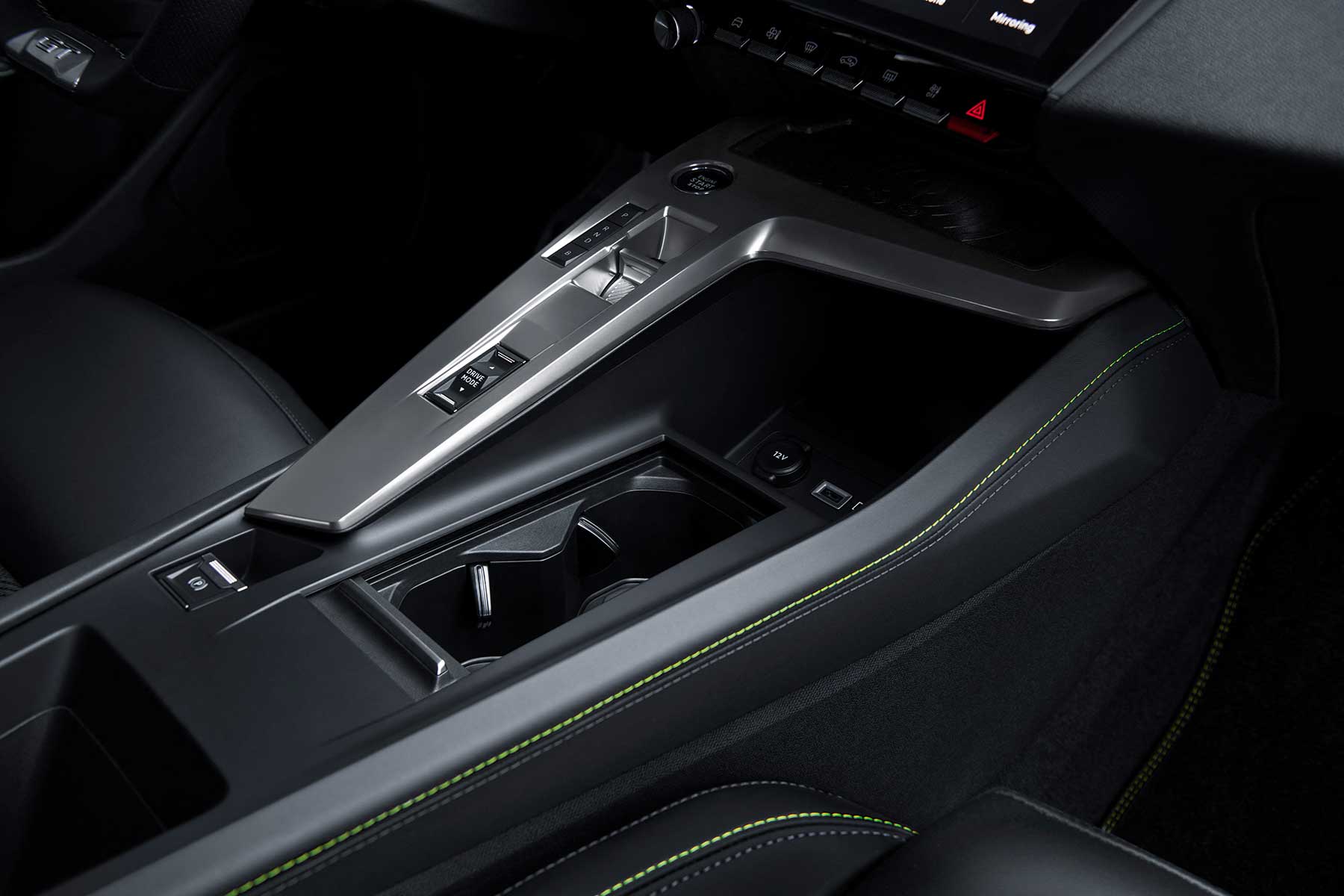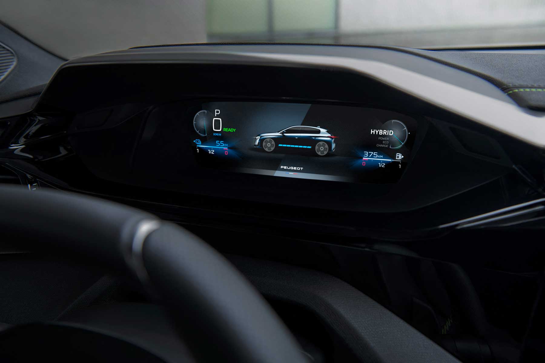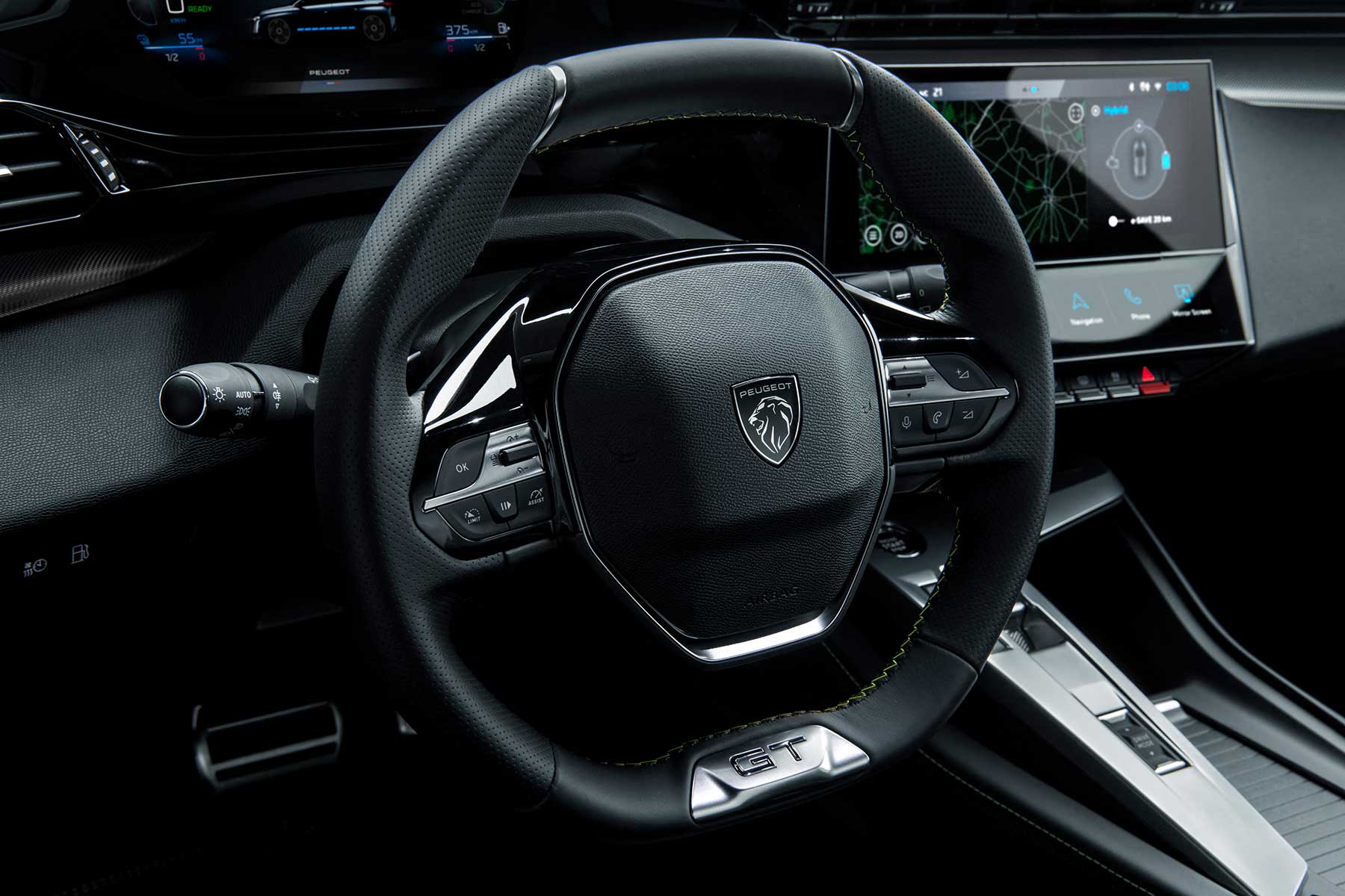 Novi Peugeot 308 ima prepoznatljivu unutrašnjost, ali je ona potpuno nova. Kao i u ostalim verzijama i-Cockpita digitalni su instrumenti postavljeni relativno visoko iza malenog volana, dok je ostatak sagrađen oko vozača. Najuočljivija razlika je pozicija 10-inčnog ekrana infotainmenta koji je postavljen niže, ispod ventilacijskih otvora što izgleda daleko elegantnije od ekrana koji strše iz armature. Infotainment ima posve novi software, a ako se vozač obrati automobilu riječima “OK Peugeot” može se s njime i porazgovarati. Ispod njega je ploča osjetljiva na dodir s prečicama, uključujući i onu za klima-uređaj, a ispod nje je i jedan red fizičkih tipki.