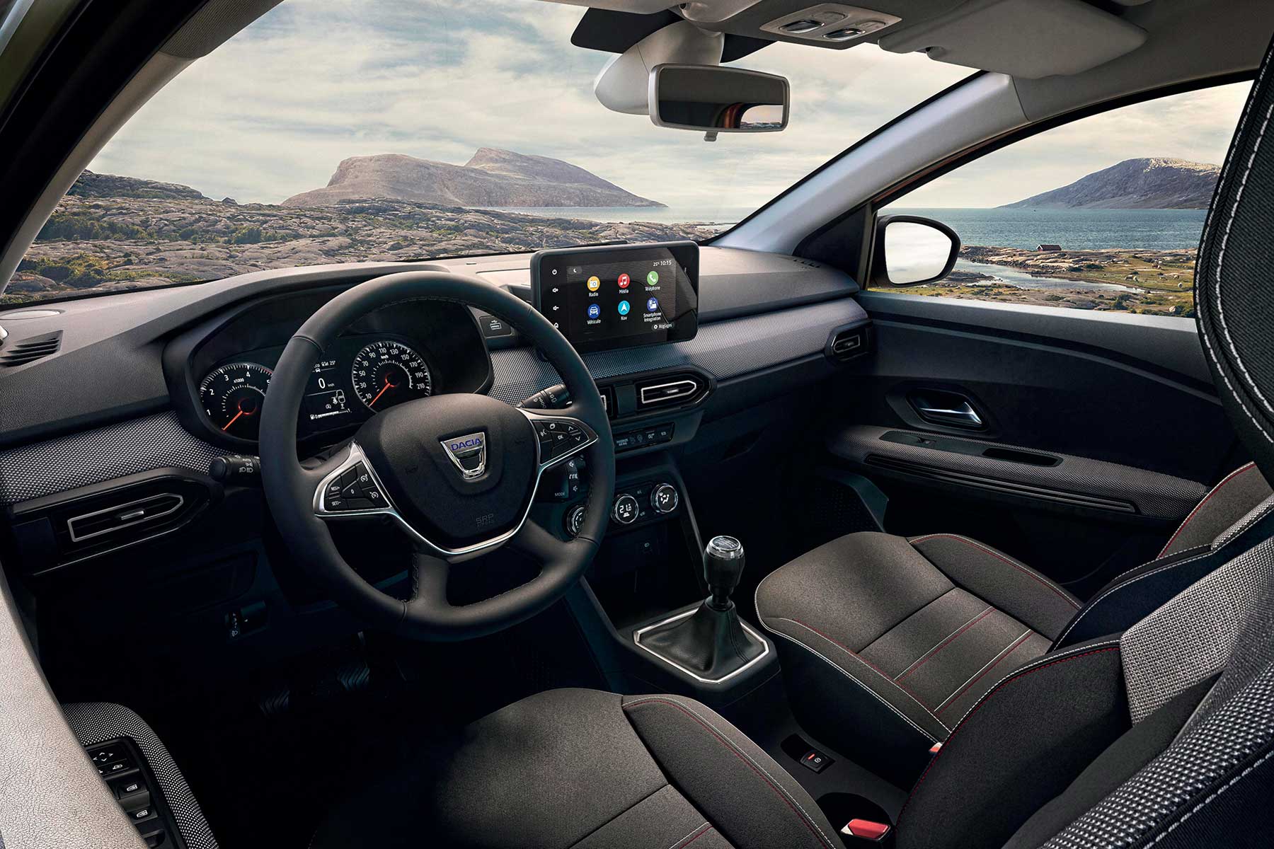 Iz perspektive prednjih sjedala Jogger je jednak Sanderu, što je dobro. Iz vozačke se pozicije automobil ne doima toliko velikim, a niti visokim. Kao i Sandero, osnovna verzija nema nikakav ekran infotainmenta, čak niti kontrole audio sustava na armaturi. Radio je tu, ali se njime upravlja putem “satelita” pored volana. U ovakvoj konfiguraciji telefon se može koristiti kao ekran, uz pomoć odgovarajuće aplikacije i nosača. Skuplje verzije imaju klasičan ekran.