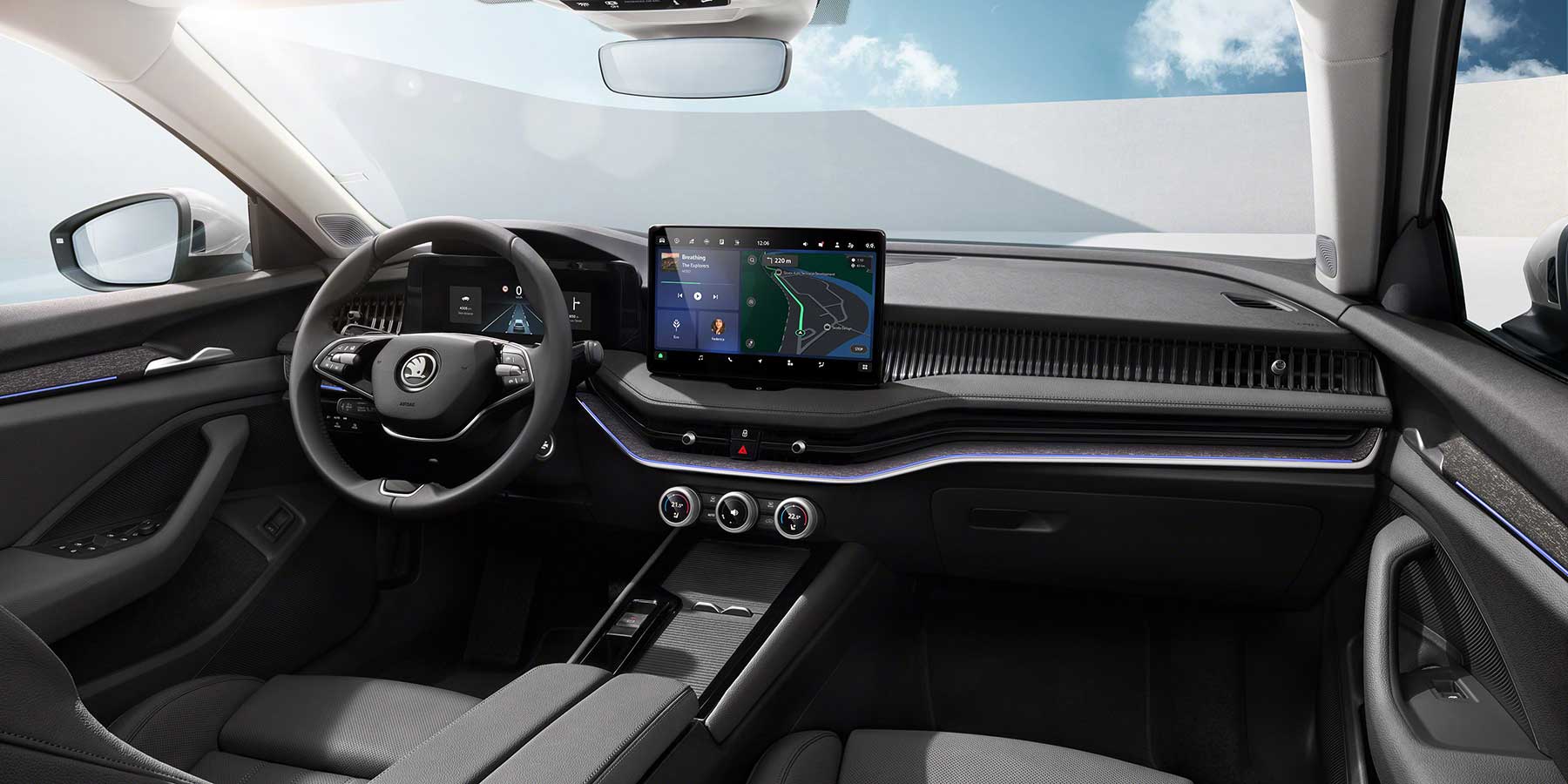 Novost je i 13-inčni head-up zaslon koji nadopunjuje virtualni kokpit od 10,25 inča i samostalni središnji ekran infotainmenta dijagonale 10 ili 13 inča, ovisno o razini opreme. Novost su i Škoda Smart Dials, inovativni rotirajući brojčanici koji pametno integriraju dodirne i digitalne komponente za intuitivnije iskustvo. Kao korak prema većoj održivosti, Škoda koristi materijale izrađene od 100 posto recikliranog poliestera za presvlake sjedala.
