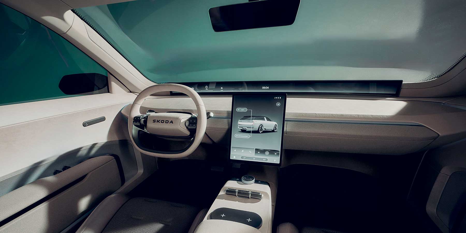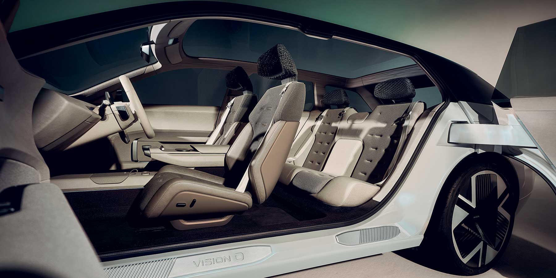 Prateći vanjski izgled, kabina Vision O usvaja čist i redukcionistički dizajn gdje svijetle boje i uredne površine stvaraju opuštajuće okruženje. Škodini dizajneri željeli su da unutrašnjost više nalikuje udobnom dnevnom boravku nego kabini automobila. Sjedala su presvučena recikliranim materijalom i imaju naslone za glavu od Ultrasint TPU-a s prozirnim efektom premaza – 65 posto biljnog podrijetla. Pod je izrađen od reciklirane kože Nabore, koja se dobiva od ostataka nakon proizvodnje.