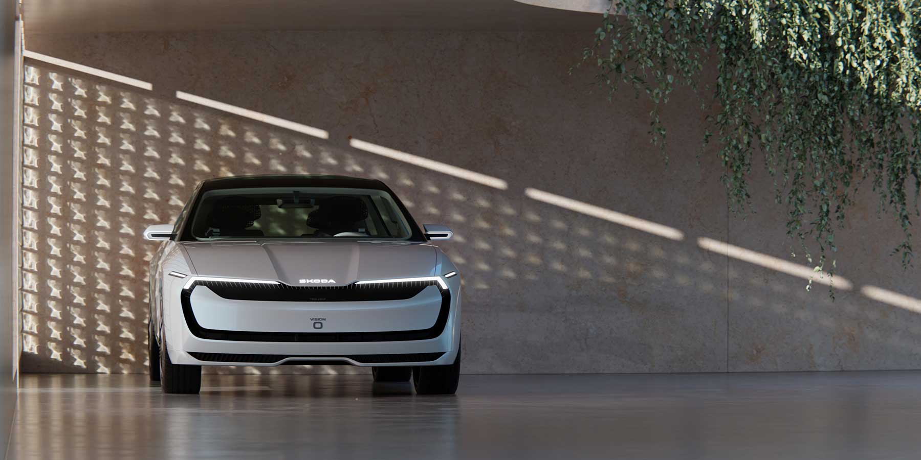 Konceptnu Škodu Vision O odlikuje futuristički dizajn koji ne bi izgledao neumjesno ni u znanstvenofantastičnom filmu smještenom u 2050. Prednji dio ima neobičan izgled bez vidljive maske. Umjesto toga, tu je ploča u boji karoserije okružena crnim okvirom koji u gornjem dijelu uključuje svjetlosni potpis. Ovaj svježi izgled prednjeg kraja Škodini dizajneri nazivaju lice “Tech Loop”. Natpis Škoda na poklopcu motora također je osvijetljen, trend koji smo već vidjeli u novijim modelima Cupre i Volkswagena.