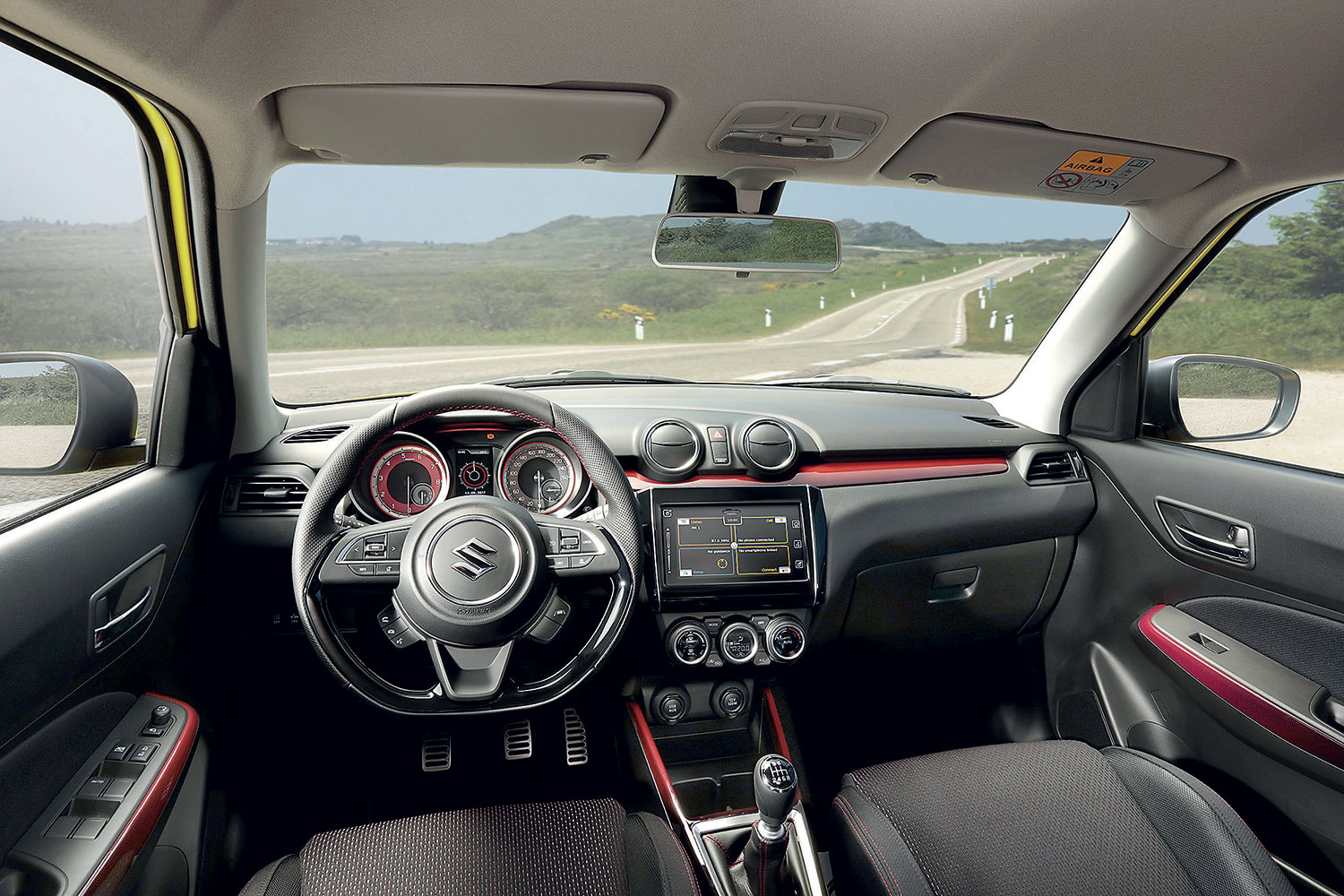 Vizualno se Swift Sport ističe agresivnijim izgledom koji naglašavaju posebna prednja maska, stražnji difuzor i dvije ispušne cijevi. Razlike u odnosu na običan model nisu pretjerane, već su dobro odmjerene i daju Sportu poseban karakter. Unutra su promjene također u detaljima. Instrumenti su kontrastnijih boja – podloga okretomjera je crvena, a brzinomjera siva, a crvenim koncem prošiveni su koža na volanu i ručici mjenjača, kao i tkanina kojom su presvučena profilirana sjedala.
