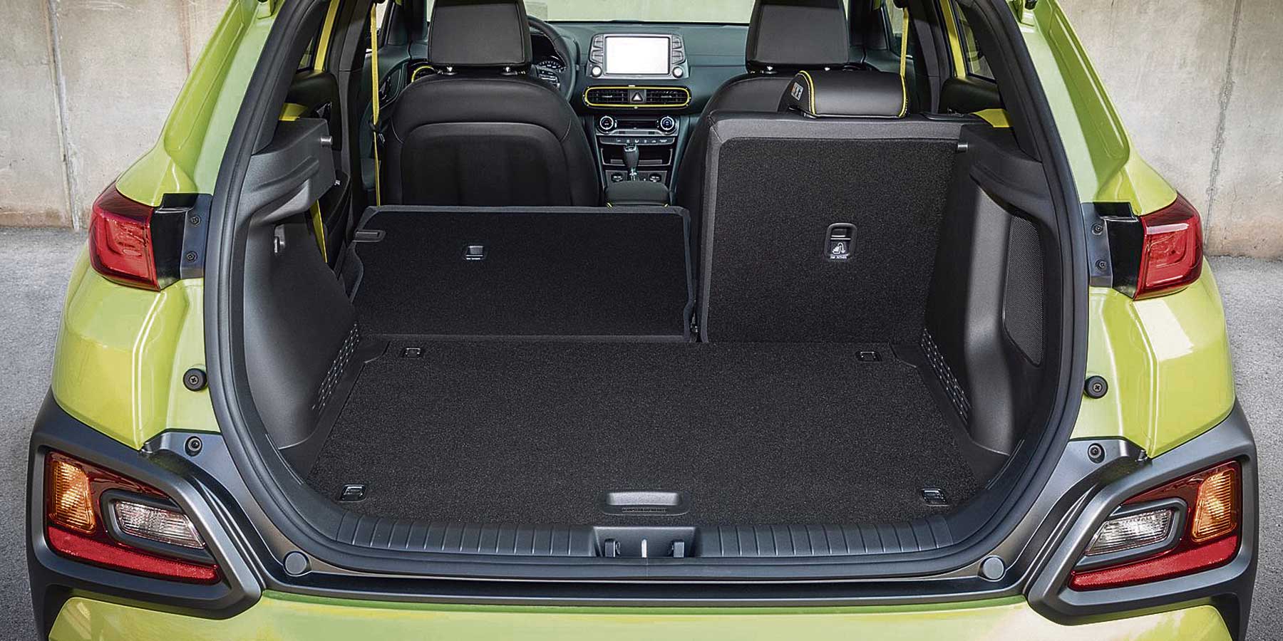 Po pitanju prostora Hyundai Kona spada u gornji dio klase. Nije najprostranija, ali četvero odraslih putnika smjestit će se bez imalo problema. Straga se niti viši putnici neće osjećati skučeno zahvaljujući dosta prostora za glave, a i prostora za koljena je dovoljno. Peti će se putnik, očekivano, morati malo stisnuti. Prtljažnik je osnovnog obujma od 361 litre što je u prosjeku klase i posve je dovoljno za svakodnevnu upotrebu. Stražnja sjedala se preklapaju u ravnu površinu i tada se oslobađa 1143 litre slobodnog prostora što je posve dovoljno za prijevoz manjeg komada namještaja ili televizora.