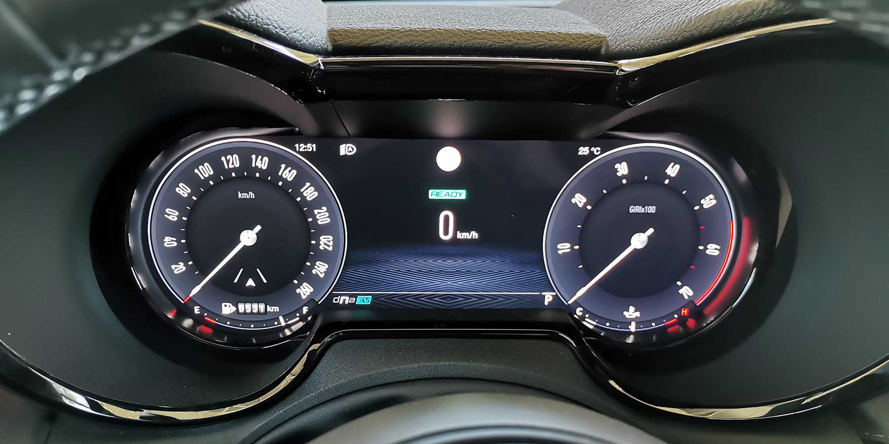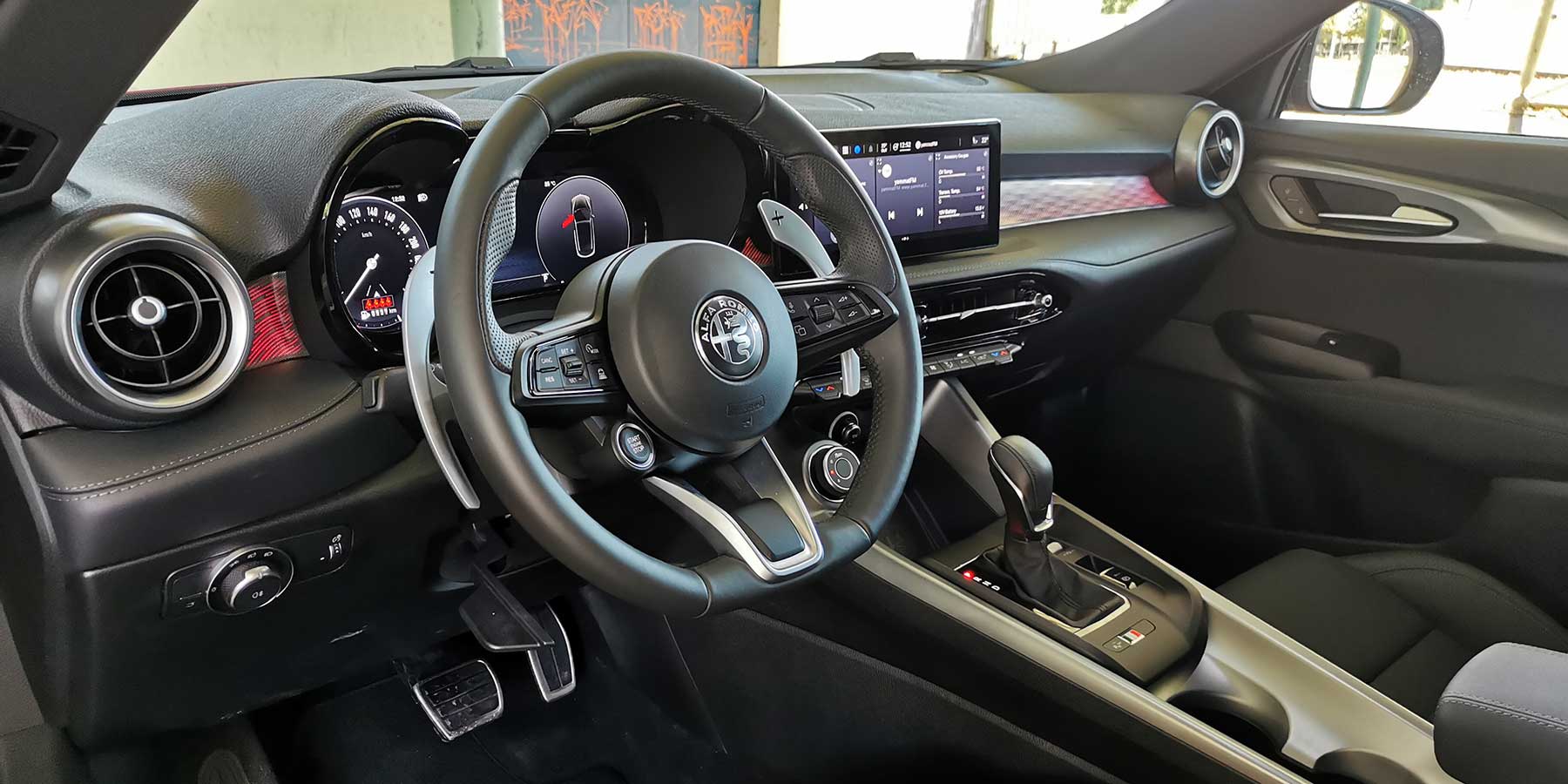 Ispred vozača je klasične instrumente zamijenio ekran, kao i u praktično svim novim automobilima, ali ugrađen je u tipičnu Alfinu “duplju”. Središnje mjesto zauzima ekran infotainmenta, koji je potpuno nov i zasnovan na Android Automotiveu. Nije savršen, ali značajno je brži i jednostavniji za upotrebu od svega što smo od Alfa Romea i Fiata dosad imali priliku koristiti. Ispod ekrana su ventilacijski otvori, a ispod njih red je atraktivno oblikovanih klasičnih tipki kojima se upravlja klima-uređajem. Nema potrebe za “čačkanje” po menijima samo da bi dodali stupanj-dva… Uz to i dobro izgleda. Za pohvalu je i mogućnost podešavanja glasnoće audio-sustava pored ručice mjenjača.