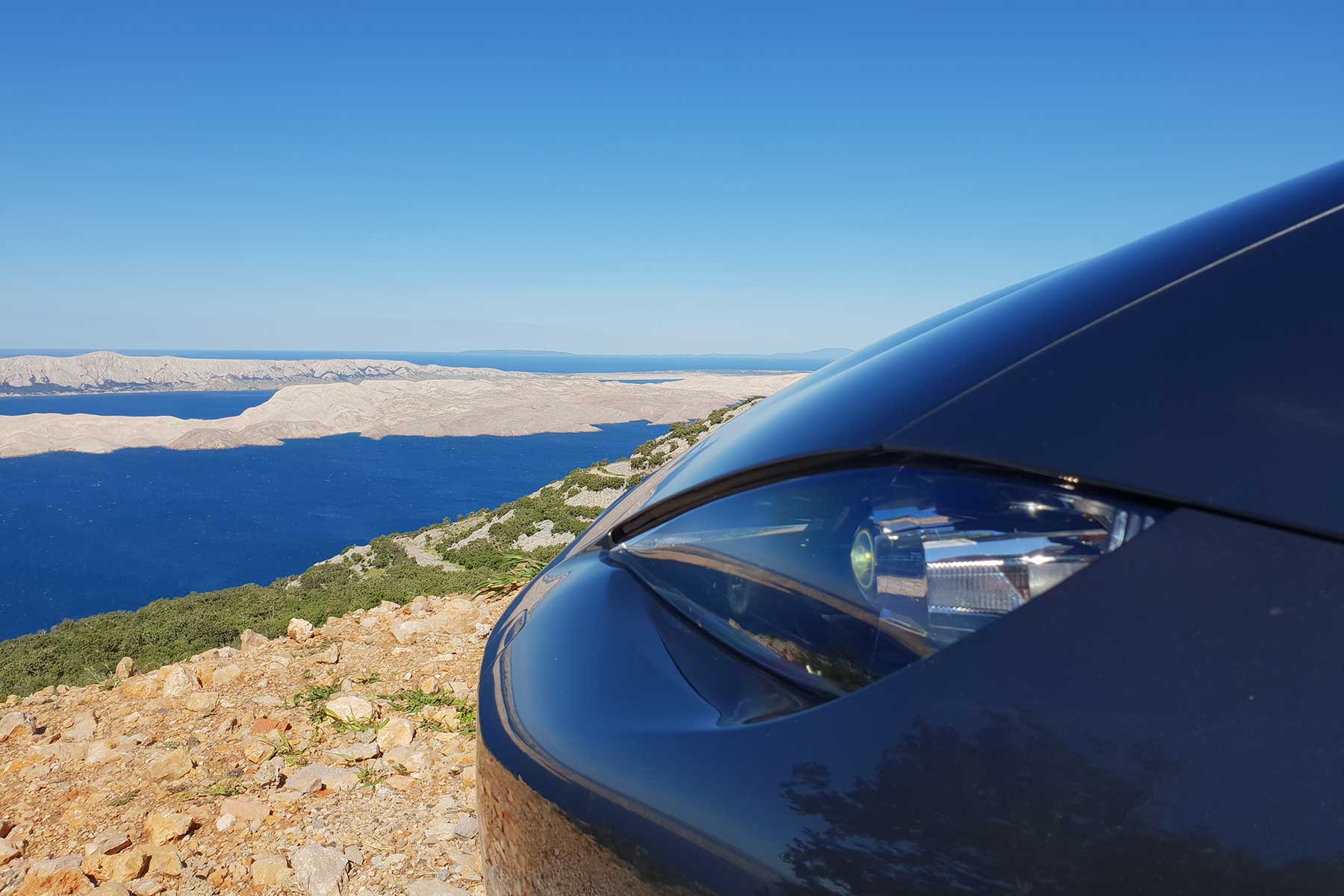 Lijeno smo se dovukli do vrha. Sunce je još bilo zubato, a drveće je stajalo pod sumnjivim kutom. Bura je jenjavala ali je i dalje bila prilično jaka. Na Vratniku smo stali na minutu upiti predivan krajolik. Čist zrak i rastjerani oblaci, pogled je pucao do Cresa! Idealni su uvjeti za vožnju. Samo da se maknemo s vjetrometine. Ovdje su udari vjetra i za lijepog dana toliki da morate paziti kad otvarate vrata na automobilu.