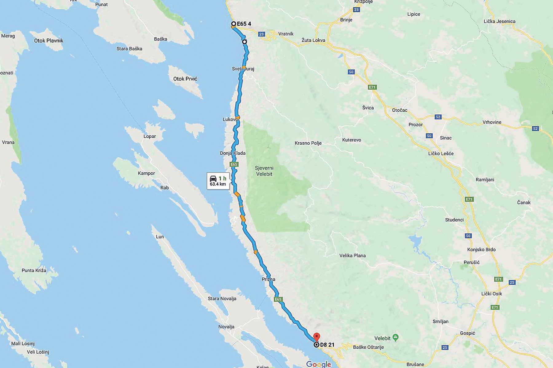 E65 napuštamo u Karlobagu. Teška srca. Da je manje prometa, odavle prema Starigradu tek počinje vrhunski igrokaz boja, reljefa i asfaltne konfiguracije. Mi danas bježimo u brda – Terezijanom. Od Karlobaga prema Gospiću.