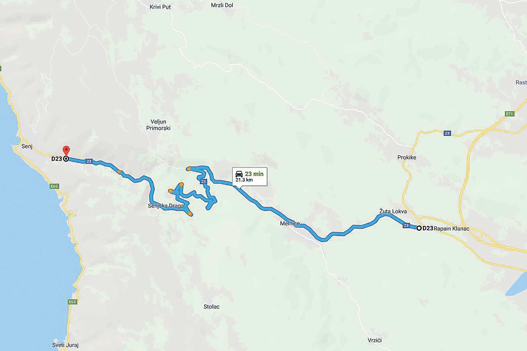 Državna cesta 23, na dionici od Vratnika do Senja počinje s par dugih dionica koje povezuju zavoje koji se zatvaraju. Nije fluidna. Traži česta kočenja i tehniciranje. Valja često žrtvovati zavoje, prilagoditi ulazak u nisku krivina kako bi na izlasku imali čistu putanju. S druge strane ovo je cesta gdje vam auto kaže sve o svom ovjesu i balansu. Kako će se ponašati na puštenom gasu kad zatvorite volan ili na kasnom kočenju kod ulaska u zavoj.