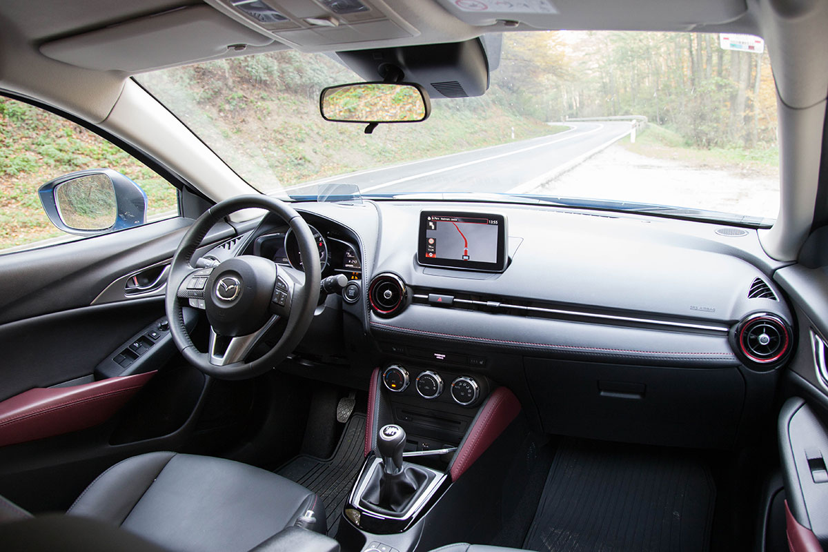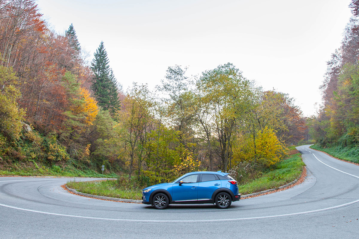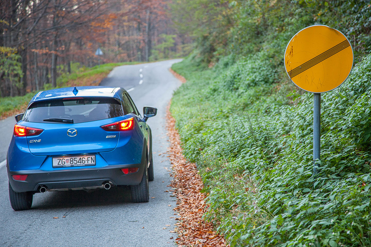 Za brdsku cestu prilično je ravna, nema bezbroj serpentina, već je čudna kombinacija ritma. Šaka brzih zavoja, prstohvat oštrih uspona, pa opet par brzih dionica, pa tehniciranje kroz vezane zavoje. Asfalt je na nekim mjestima prošaran pukotinama i udarnim rupama. Ovdje prvi put doživljavam osobnost CX-3. Do malo prije je bila tek prijevoz koji me dovezao do ovdje. Sad se gnijezdi iz zavoja u zavoj, namješta se stražnjicom, tek toliko da osjetim da je živahna. Upija neravnine i precizno se usmjerava prema sljedećem zavoju.